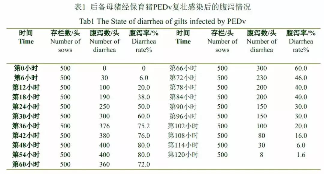 • 后备猪接触经PEDv感染复壮后的腹泻情况及恢复正常时间;