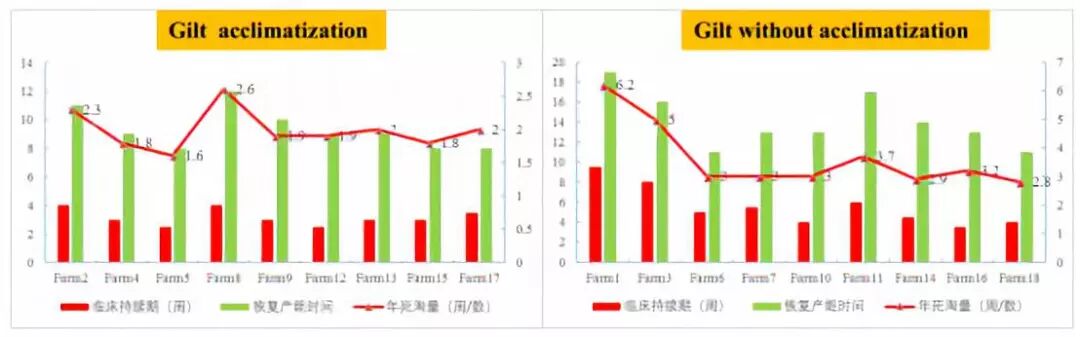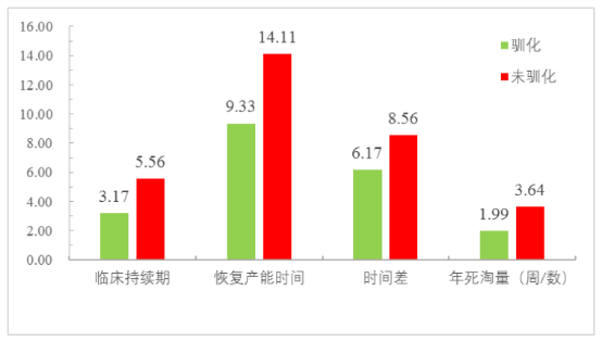 经驯化猪场临床平均持续期为3.16周,恢复产能时间为9.33周,年死淘量为1.99周批断奶仔猪,明显低于未经驯化的猪场,年度死淘量减少了1.65周批断奶仔猪。