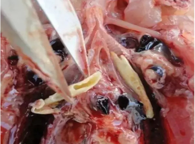 鸡群突然发病,临床常无明显症状,传播快,一般1~2天可迅速波及全群,死亡率高,从出现死亡开始每日翻倍增长,日死亡率高达10%左右。发病初期表现轻微的呼吸道症状,病鸡“吭吭”甩鼻,流清鼻液,眼睑变长,眼圈内有泡沫,之后出现呼噜,咳嗽,张口伸脖喘、“呴呴”怪叫的症状,鸡群采食量严重下降、羽毛蓬乱、缩头闭眼,个别鸡排黄绿色稀便,最后出现支气管栓塞并发肺栓塞,窒息而亡。死亡鸡只多为中上等个体并且大部分都肚皮朝上,两腿蜷曲。