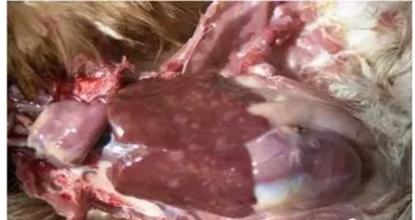 3、肝表面有灰黄色和灰白色结节或肿瘤———马立克氏病、淋巴细胞白血病、结核病。