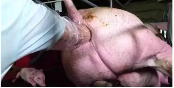 用肥皂水彻底清洗手臂后,再用冷开水冲洗掉肥皂水,往手臂上涂满专用的润滑剂(也可带上一次性无菌长臂手套涂上润滑剂),然后五指并拢(剪短指甲不要划破产道),随手轻轻在产道旋转,慢慢伸进产道,摸到小猪卡在子宫口,如果是摸到头,可以把五指分开,食指跟中指放在小猪2个耳后,大拇指无名指小拇指并拢,慢慢将小猪带出来。