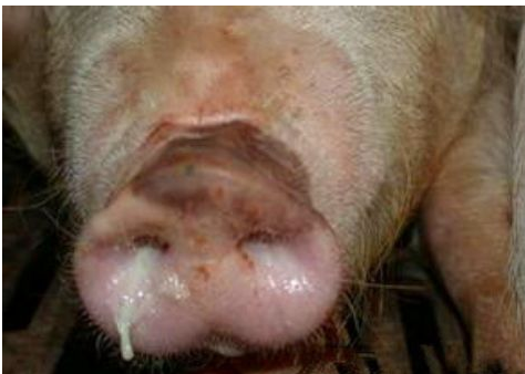 临床症状:(1)猪群表现突然发病或表现开始数个猪只不吃料,2-3后天全群基本感染,群体采食量下降30%-60%不等;(2)感染对象均是保育仔猪或中猪、大猪,一般是从中猪、大猪开始发病,逐渐漫延到保育仔猪;(3)病猪可见打喷涕,流清鼻涕或脓性鼻涕,咳嗽、呼吸急促,腹式呼吸明显,特别是在卧睡的时候