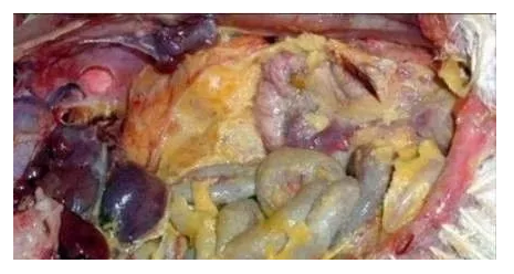 产蛋鸡感染禽流感、鸡新城疫、传染性支气管炎、传染性喉气管炎、产蛋下降综合征及禽脑脊髓炎等病毒时,会出现卵泡充血、出血,卵泡膜破裂,卵子液化等病变,引起卵黄性腹膜炎。卵黄性腹膜炎的轻重、出现的快慢与感染病毒种类、毒力、数量及鸡群健康状况有关。