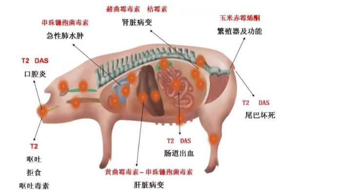 育肥猪:仔猪假发情、厌食、呕吐、咳嗽脱肛、生长缓慢,造成各种疫 苗免疫抑制,是各种传染病的导火线,是影响猪场生产效率的无形杀手。