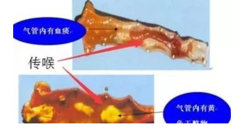 顾名思义,传喉的主要发病部位在喉部,传支的发病部位在支气管。就发病部位而言,传喉在呼吸道的上端,传支在呼吸道的下端。另外,病鸡感染传喉后,剖检病死鸡,鼻腔严重充血、出血、有多量鼻液。病鸡喉头、气管上1/3黏膜溃烂出血、有针尖样出血点,气管内有多量血痰。