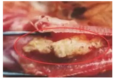 慢性传喉病例的喉头或上1/3气管有黄白色干酪物堵塞。感染传支的病死鸡,则在气管的下1/3、支气管有浆液性或黄白色干酪样物堵塞,尤其在气管和支气管交叉口常常形成“人字形”黄色干酪物堵塞。