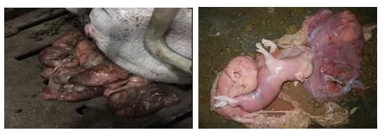 临床诊断要点:母猪发情迟,不发情,受胎率低、产仔数少、初生重偏轻,甚至发生流产、产弱胎,死胎等。