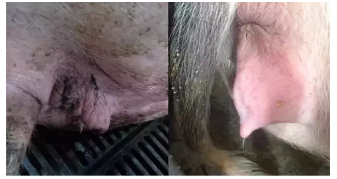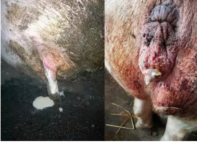 2.慢性型:病猪间歇性从产道内流出混浊的粘液。母猪即使能够发情,也容易造成屡配不孕。有的配种之后,在怀孕期,从产道流出白色豆腐渣样的粘液;有的会出现孕期的流产现象。