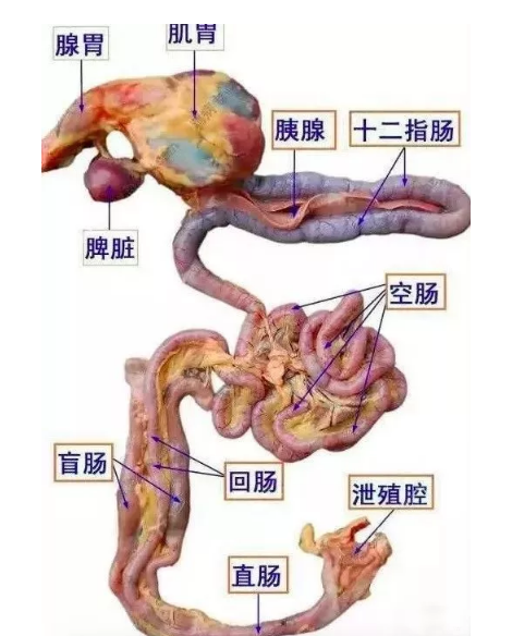 先来看看肠道对鸡来说到底有多重要。首先,肠道是鸡最重要的消化器官。鸡与哺乳动物相比,口腔内无牙齿也不分泌唾液,嗉囊只是食物暂时储存及软化的场所,腺胃分泌的胃液也很有限,肌胃有一定的哺乳动物牙齿的功能也只是磨碎食物,而口腔和胃等几乎没有对营养物质的吸收功能。