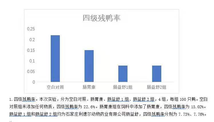 1.四级残鸭率。本次实验,分为空白对照、肠胃康、肠益舒1组、肠益舒2组,4组,每组100只鸭。空白对照组未添加任何物质,四级残鸭率为22.6%。肠胃康组在饲料中添加了肠胃康,四级残鸭率为15.02%。肠益舒1组和肠益舒2组均为石家庄利德尔动物药业有限公司肠益舒,四级残鸭率分别为7.73%、7.76%。