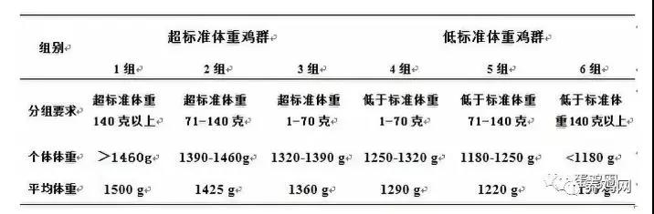 首先,以京粉1号父母代蛋种鸡19周龄末的标准体重(1320克)为基础,以70克为分组梯度,分为6组,每组3个重复,每个重复96只鸡,各组鸡只的体重均符合分组要求: