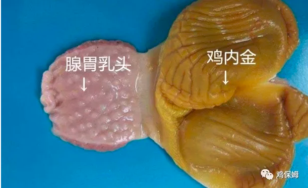 腺胃很小,但消化腺特别发达,能分泌大量的消化液(主要是盐酸和蛋白酶),饲料在腺胃停留的时间很短,与消化液混合之后很快进入肌胃。肌胃是鸡特有的消化器官,胃壁特别发达,由坚厚的肌肉构成,胃内表面覆盖着坚韧的角质膜。鸡没有牙齿,全靠肌胃角质膜和采食时积存的沙砾,通过肌肉强有力的收缩运动来磨碎饲料,起着咀嚼作用。上图是腺胃肌胃都是一个比较正常的图片,腺胃乳头饱满,不出血,鸡内金光滑有光泽,没有裂口,下图是一个病变的腺肌胃: