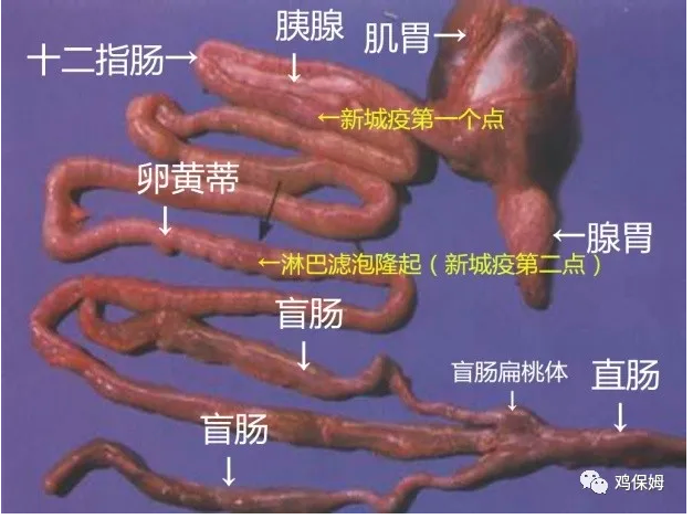 鸡有非典型新城疫的时候就看图中的几个点:腺胃乳头、十二指肠降端、卵黄蒂下淋巴滤泡、盲肠扁桃体,如果有2个或者2个以上的淋巴滤泡隆起就可以判断为新城疫。